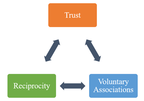 Based on Putnam’s viewpoint, voluntary associations promote horizontal connections between people and generate trust. This trust leads to reciprocity, social networks, and the development of voluntary associations, forming the foundation of social capital. There is a cycle among trust, reciprocity, and voluntary associations: trust generates reciprocity and voluntary associations; the strengthening of reciprocity and voluntary associations also generates trust (Putnam, 1993b, pp. 163-185) (Figure 3). At the same time, Putnam particularly links trust, reciprocity and civic engagement, using this as an index of the strength of civil society. In short, social capital is closely related to social participation (primarily through social participation in voluntary associations). Therefore, Putnam believes that social capital is a direct measure of civic strength and can serve as a tool reflecting social, political, and economic prosperity (Putnam, 1993a, 1995, 2000). However, some scholars (Portes, 1998; Brucker, 1999; Foley & Edwards, 1999; Swain, 2003) consider that Putnam has not accurately analysed the causal relationship between social capital and social, political, and economic prosperity. Furthermore, Putnam has not discussed the conflicts and internal power structures between political parties and voluntary associations or the contradictions between civil society and political society (and the state) (Siisiäinen, 2000).