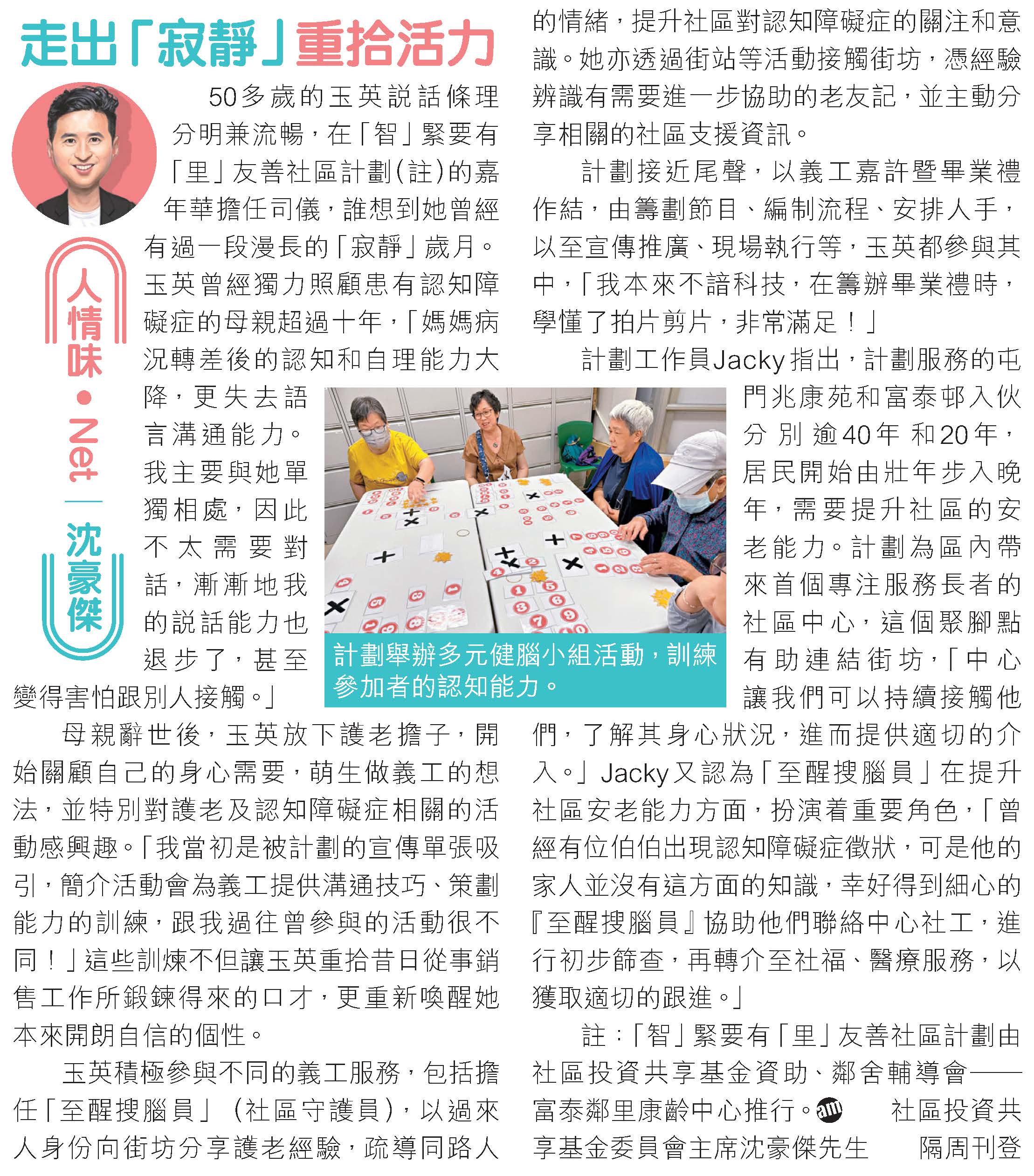 註:「智」緊要有「里」友善社區計劃由社區投資共享基金資助、鄰舍輔導會 — 富泰鄰里康齡中心推行