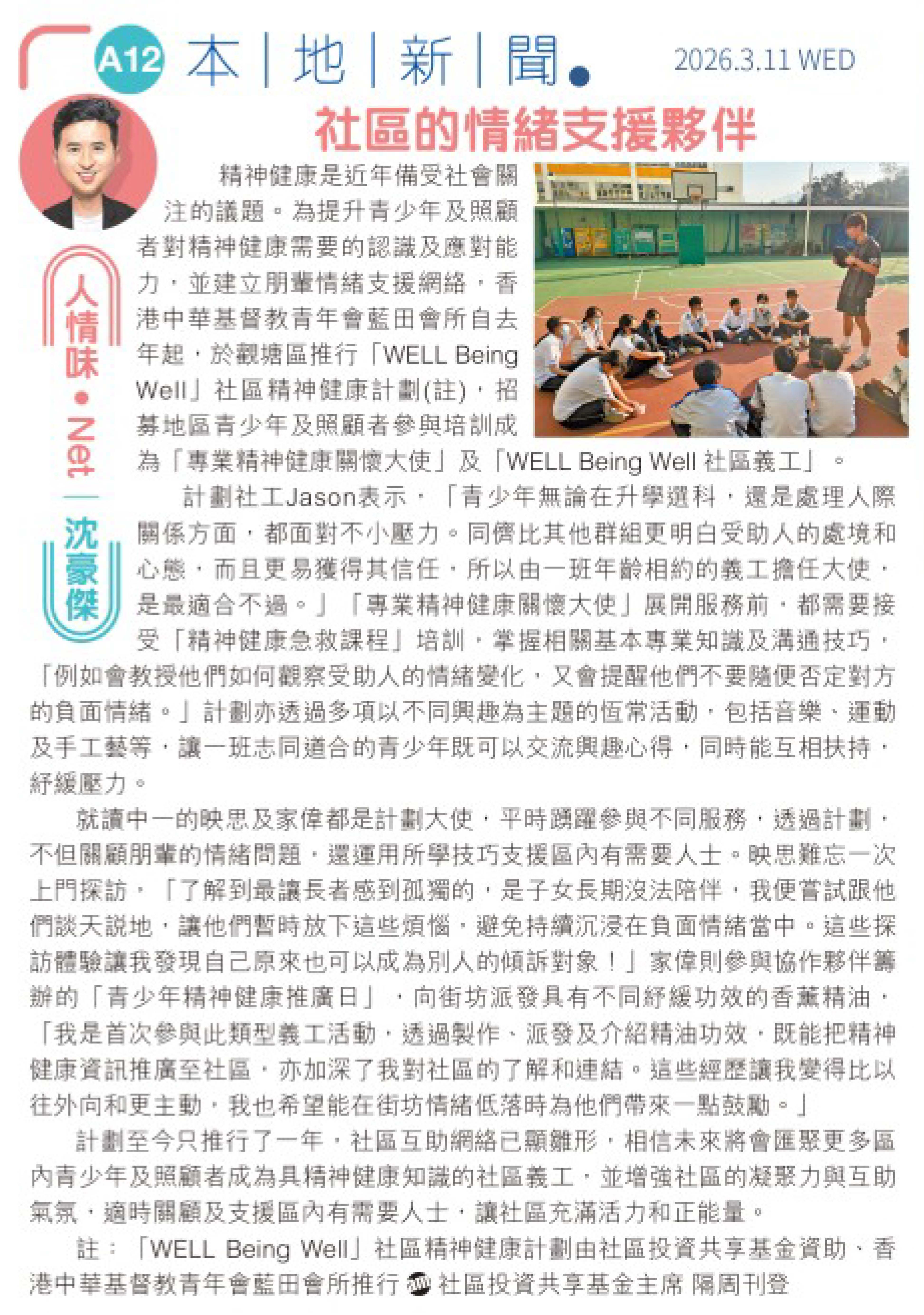 精神健康是近年備受社會關注的議題,為提升青少年及照顧者對精神健康需要的認識及應對能力,並建立朋輩情緒支援網絡,香港中華基督教青年會藍田會所自去年起,於觀塘區推行「WELL Being Well」社區精神健康計劃(註),招募地區青少年及照顧者參與培訓成為「專業精神健康關懷大使」及「WELL Being Well 社區義工」。