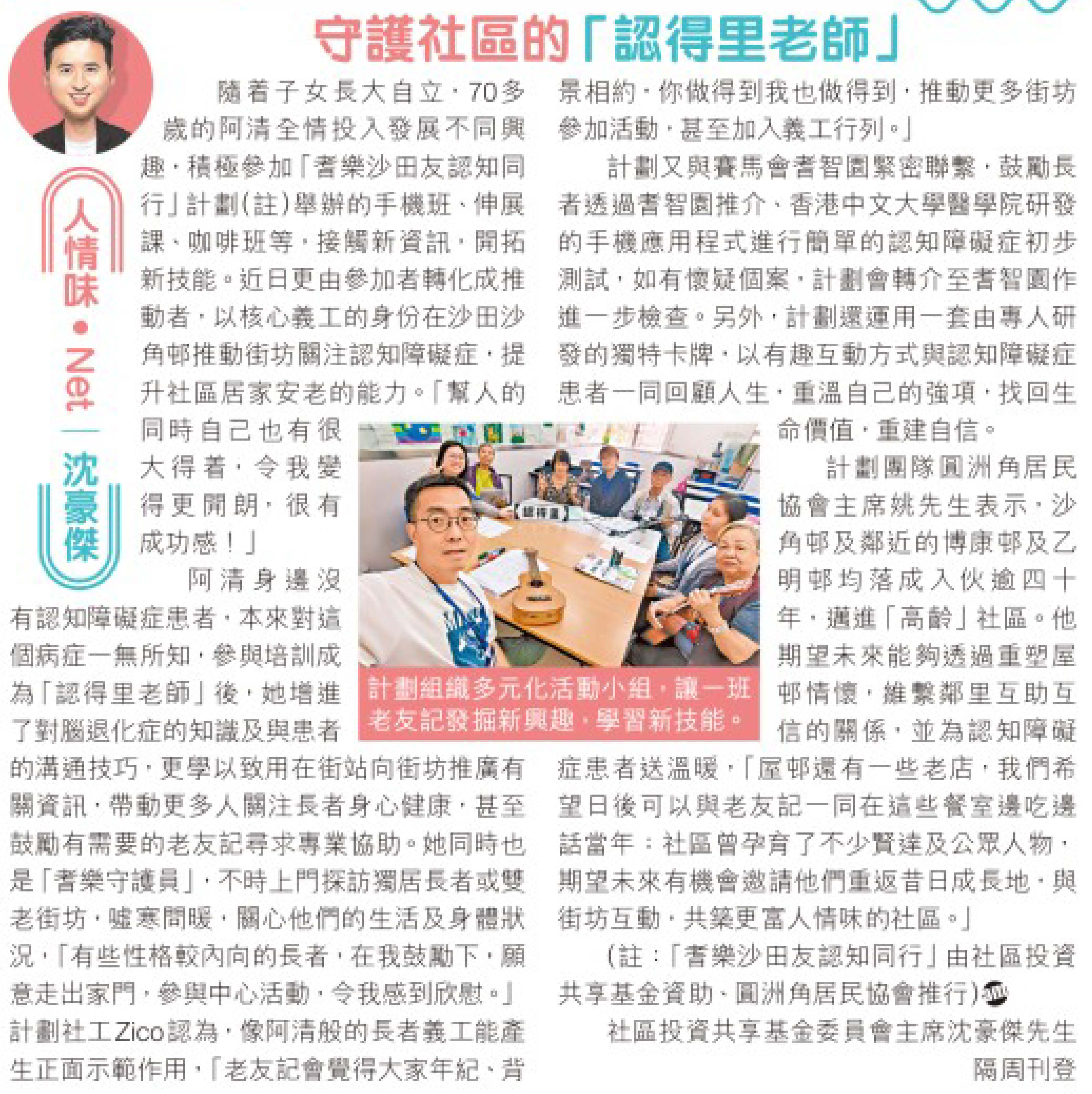 註:「耆樂沙田友認知同行」由社區投資共享基金資助、圓洲角居民協會推行